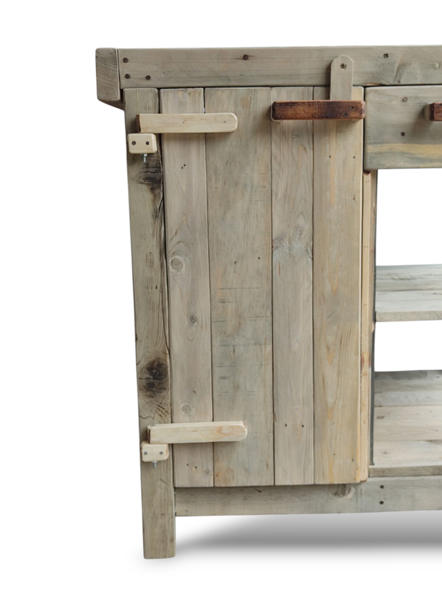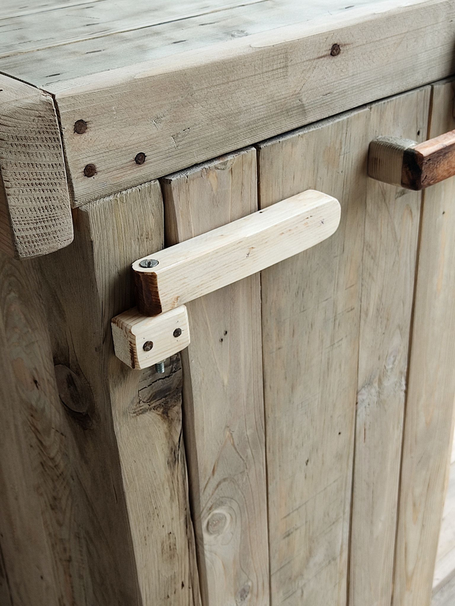 Chaque console est fabriquée à la commande. Le bois recyclé peut présenter des marques, nœuds ou variations naturelles. Les photos sont des exemples de réalisations précédentes. Pour toute demande spécifique, vous pouvez nous contacter avant la commande.