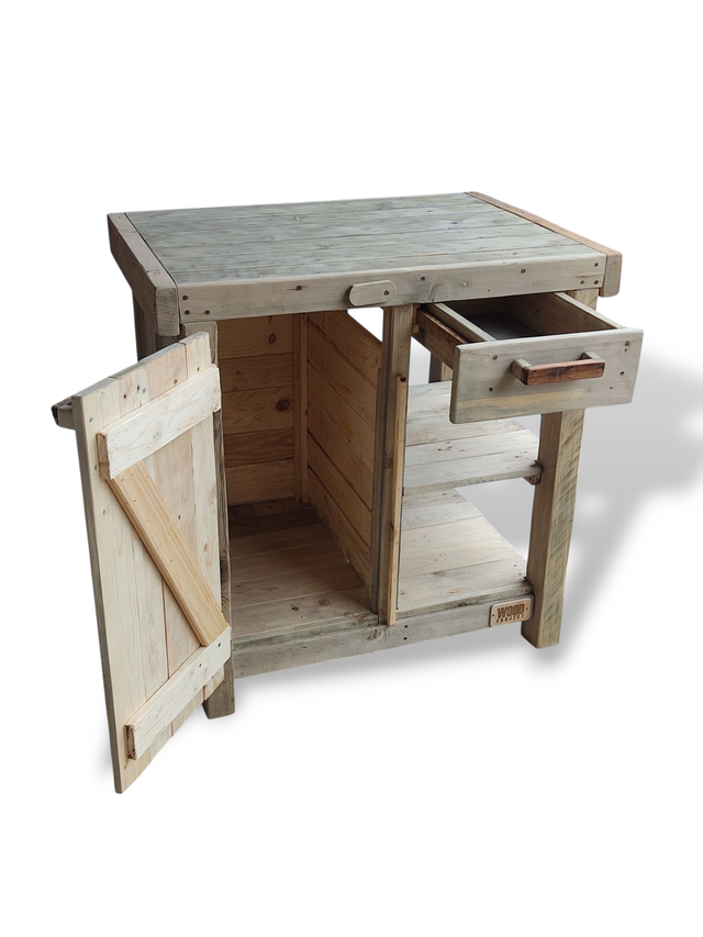 Le modèle standard correspond à une console de 90 cm de longueur, 60 cm de profondeur, 90 cm de hauteur, 1 étagère milieu et 1 étagère basse, sans tiroir, et planches de coffrage sur 3 faces, finition brute poncée, 1 tiroir, 1 porte de placard.